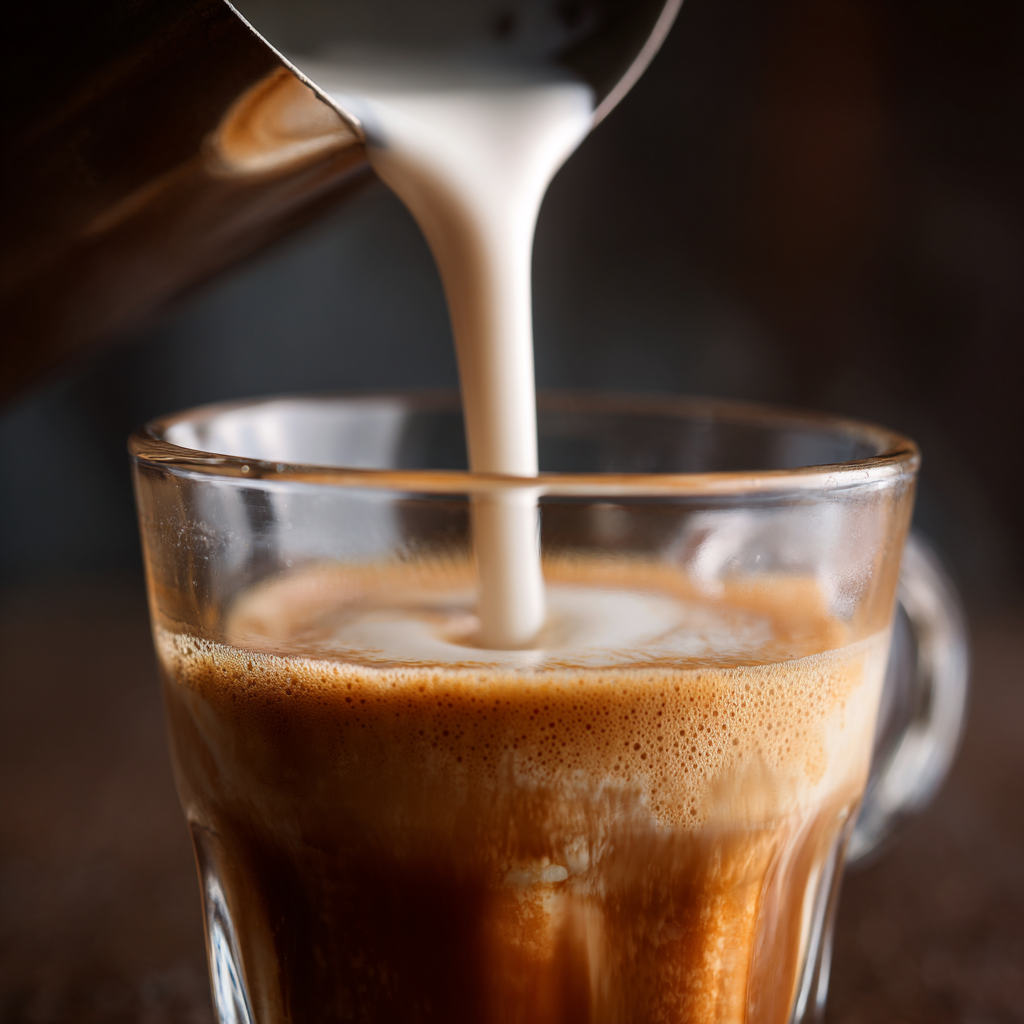- Pour the steamed milk gently over the espresso in a 1:1 ratio.